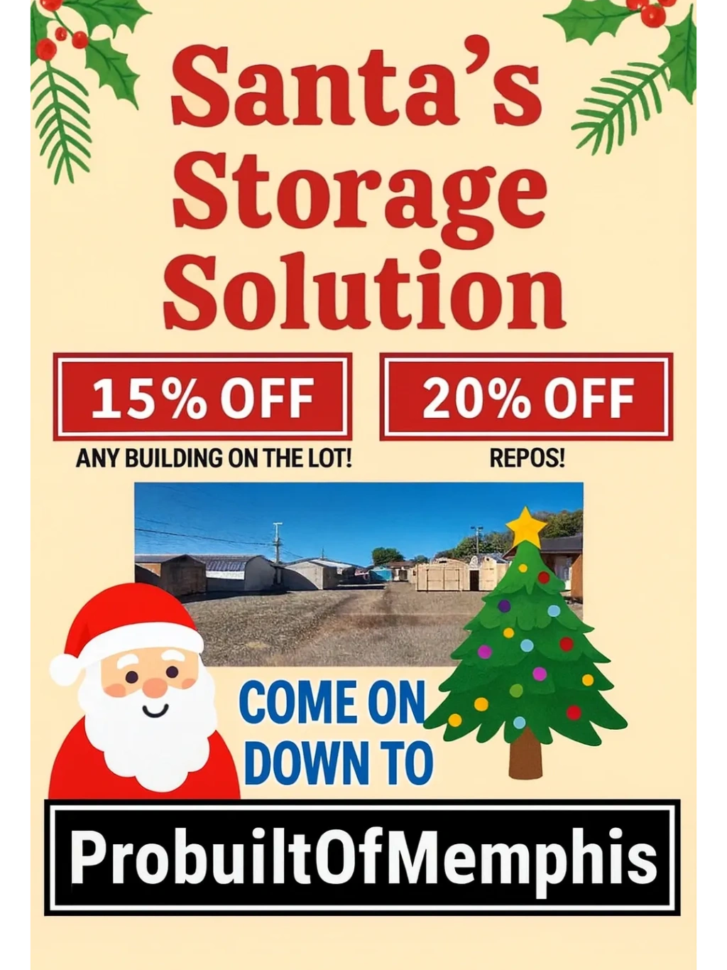 Ho‑Ho‑Hold on to your holiday savings! 🎅 This December, ProBuilt of Memphis is making it easy to store more with Santa’s Storage Solutions. From backyard sheds to full workshops, we’ve got the perfect place for toys, tools, and treasures. Don’t miss these limited‑time offers—it’s the gift of storage you’ll enjoy all